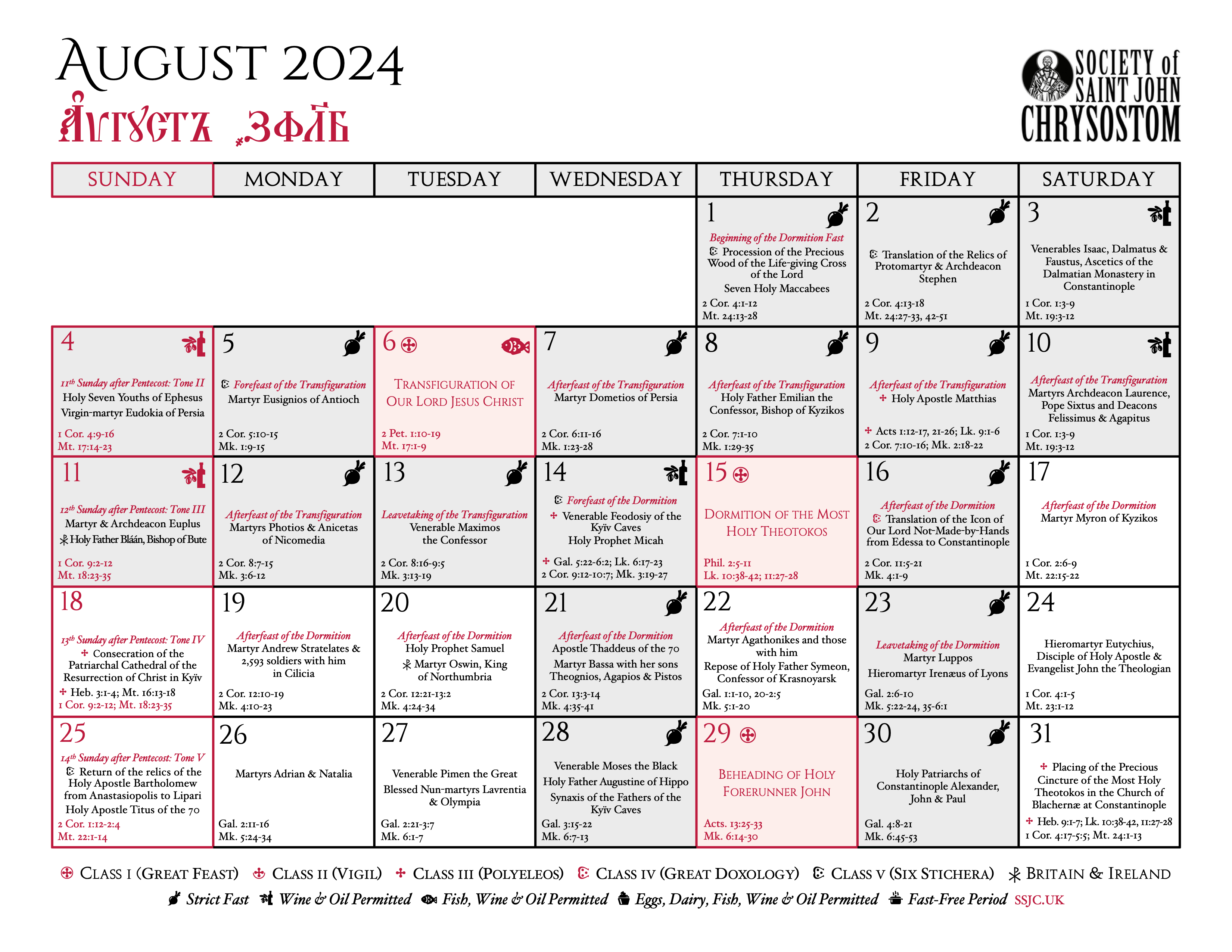 The Society has published its Byzantine liturgical calendar for August 2024.